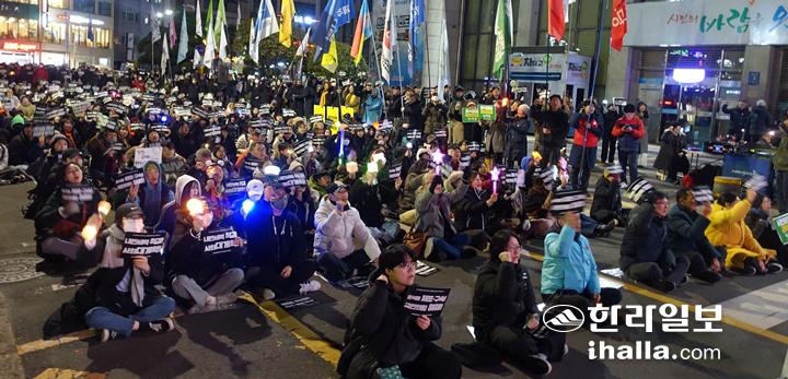 추모행동을 마친 시민들은 저마다 가방 또는 주머니에서 '내란세력 척결 사회대개혁' 등이 적힌 팻말과 야광봉을 꺼내들고 시청 일대를 메웠다.