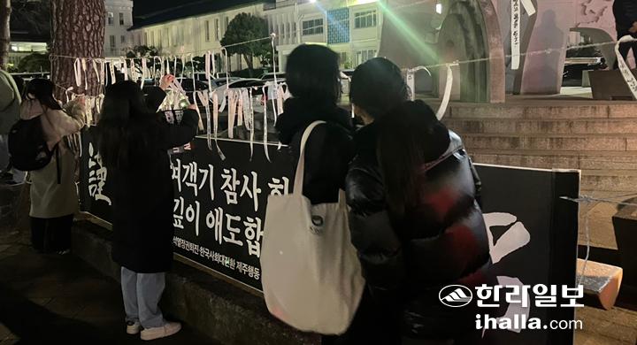 제주항공 여객기 참사에 따른 국가애도기간 마지막 날인 4일 제주시청 일대는 다소 무거운 공기가 감돌았다. 어두운 색상의 옷을 입은 시민들은 추모 현수막 앞에 모여 각자 추모 메시지를 적은 리본을 매달았고, 두 손을 모으고 두 눈을 감아 희생자의 넋을 기렸다.