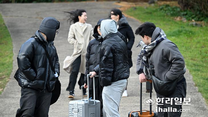 [한라일보] 올겨울 들어 가장 추운 날씨를 보인 9일 제주시 도두동을 찾은 관광객들이 온 몸을 움츠린 채 차가운 바람을 맞으며 걸어가고 있다. 강희만기자
