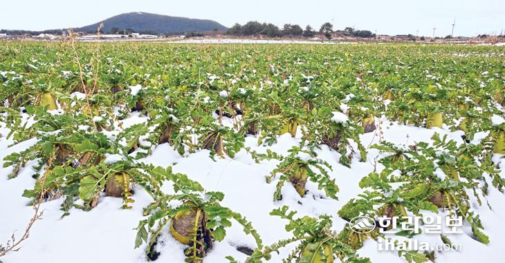 주말 제주를 덮친 눈과 한파 날씨로 인한 농작물 피해가 우려되는 가운데 12일 서귀포시 성산읍 수산리 한 월동무 밭에서 무들이 눈에 파묻혀 있다. 강희만기자