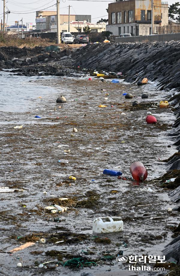 [한라일보] 14일 제주시 한림읍 옹포리 해안가에 제주바다 불청객인 괭생이모자반이 밀려와 수면위를 덮고 있다. 강희만기자