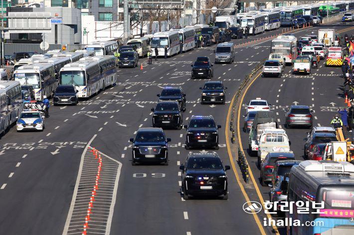 윤석열 대통령이 탄 차량 행렬이 15일 서울 용산구 한남동 대통령 관저에서 과천 공수처로 향하고 있다. 연합뉴스