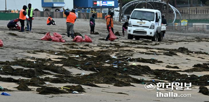 [한라일보] 16일 제주시 이호해수욕장에서 바다지킴이들이 파도에 떠밀려온 괭생이모자반을 수거하고 있다. 강희만기자