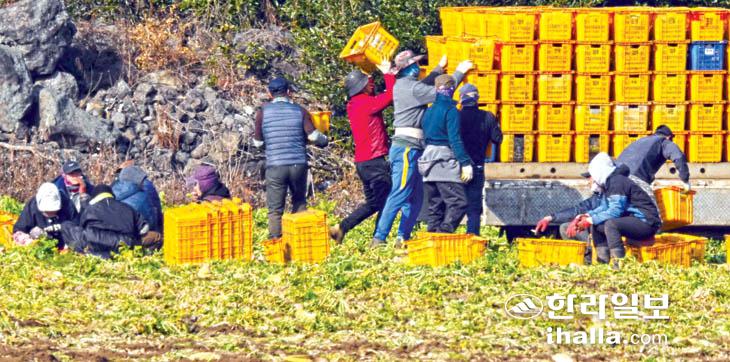 [한라일보] 21일 서귀포시 성산읍 수산리에서 농민들이 월동무 수확 작업을 하고 있다. 강희만기자