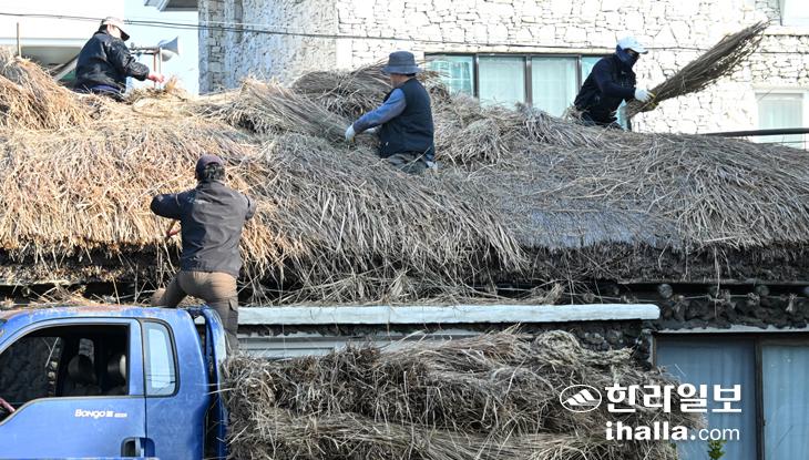 [한라일보] 21일 서귀포시 성읍민속마을에서 마을 주민들이 제주 전통 초가 지붕을 잇는 작업을 진행하고 있다. 강희만기자