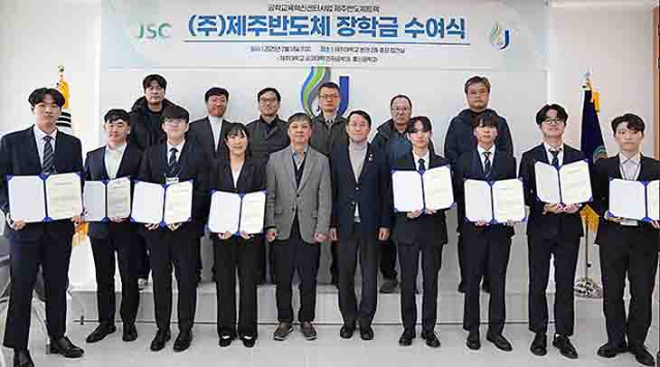 제주대학교 공학교육혁신센터사업 제주반도체트랙 참여기업인 (주)제주반도체는 지난 14일 제주대 공과대학 전자공학과·통신공학과 학생 10명에게 총 2500만원의 장학금을 전달했다.