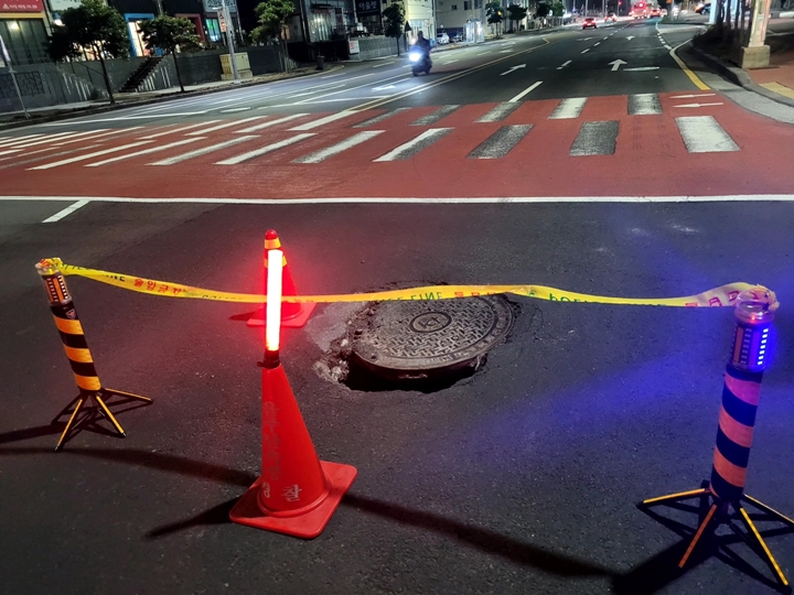 19일 제주시 건입동 제주항 1부두 입구 인근 도로에서 발생한 싱크홀. 도소방안전본부 제공
