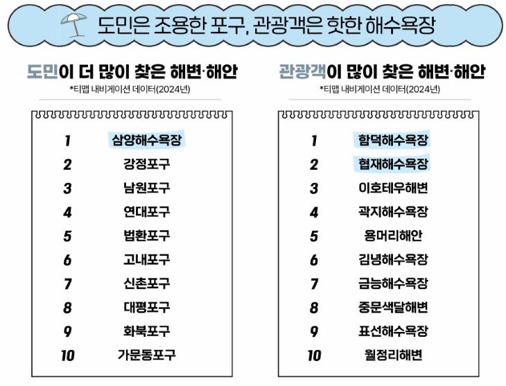 해변·해안인 경우 관광객들은 함덕해수욕장, 협재해수욕장 등 제주를 대표하는 해변이 인기 있는 반면, 도민들은 삼양해수욕장, 강정포구 등 한적한 포구와 접근성 좋은 해변을 선호하는 것으로 나타났다.