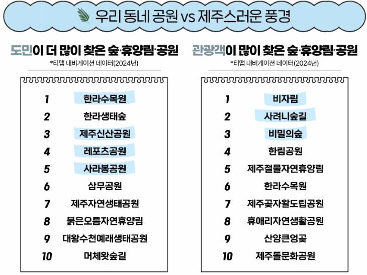 숲·공원·휴양림의 경우 관광객들에게 인기 있는 장소는 비자림, 사려니숲길 등 제주다운 자연경관을 즐길 수 있는 곳들이었고, 도민들은 한라수목원, 제주신산공원 등 접근성이 좋고 일상 속에서 여유를 즐길 수 있는 장소를 더 찾았다.