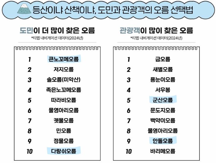 이번 분석은 지난해 티맵내비게이션 데이터(총 1525만1403건)의 관광객과 도민의 차량 도착 수를 비교하는 방식으로 진행됐다. 관광객의 시선은 관광객의 도착 수가 많은 곳을 기준으로 분석했으며, 도민의 시선은 도민이 관광객보다 더 많이 방문한 장소를 기준으로 분석했다.