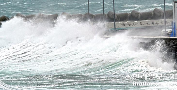 제주도전해상에 풍랑주의보가 발효된 18일 제주시 탑동 방파제에 거대한 파도가 거세게 밀려오며 도로로 넘치고 있다. 강희만기자