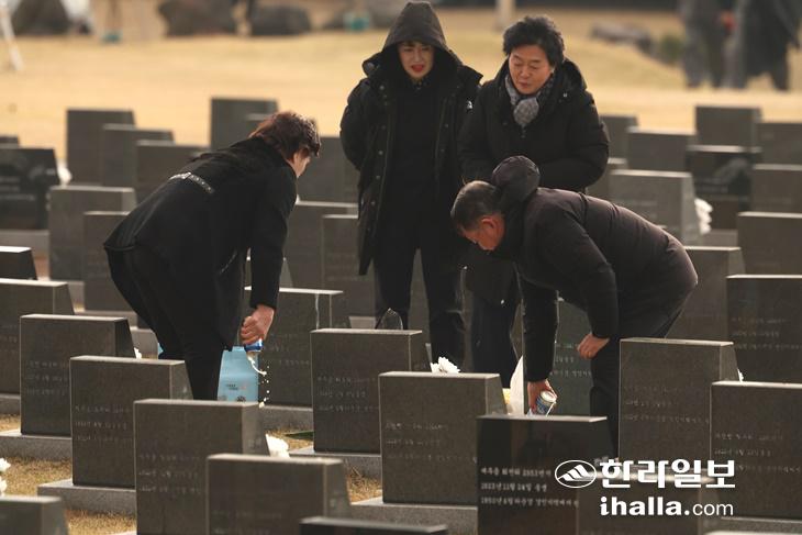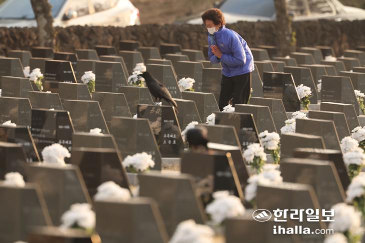 3일 오전 4·3희생자 추념식 전 4·3평화공원 행방불명인 표석을 찾은 유족이 참배하고 있다. 제주도사진기자회