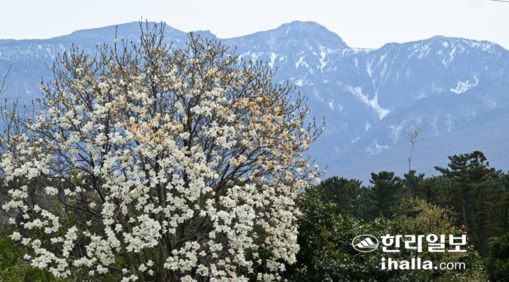활짝 핀 목련과 잔설이 남아 있는 한라산. 한라일보DB