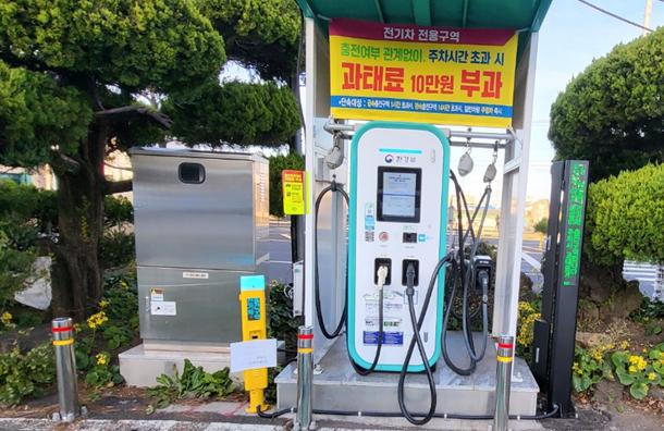 전기차 충전소에 충전방해 행위 단속장비(왼쪽 타원)와 단속 안내 전광판(오른쪽 타원)을 설치한 모습. 제주시 제공
