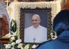 선종한 프란치스코 교황의 분향소가 마련된 23일 제주시 관덕로에 있는 천주교 제주교구 주교좌 중앙성당에서 신자들이 추모를 하고 있다. 강희만기자
