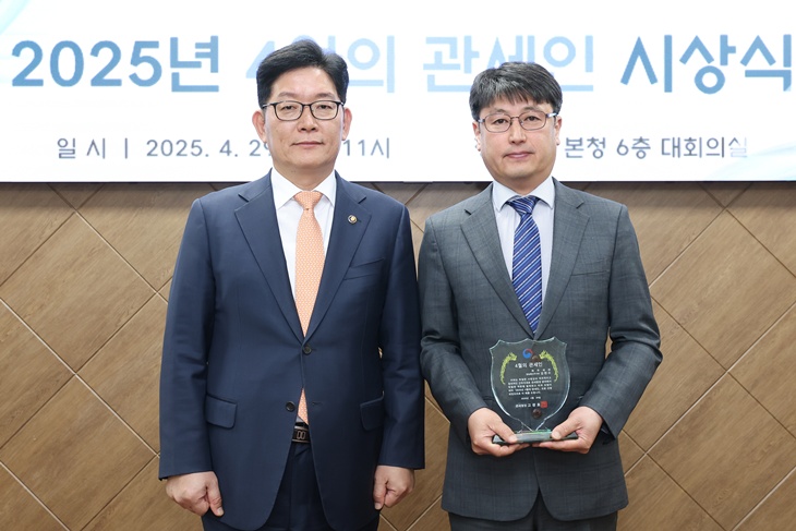 고광효 관세청장이 29일 4월의 관세인에 선정된 제주세관 김현수 주무관(오른쪽)과 기념촬영하고 있다. 관세청 제공