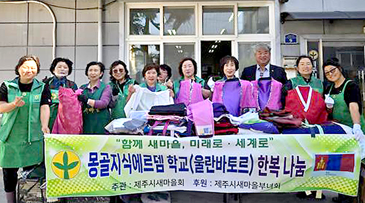 제주시새마을회(회장 유철수)는 최근 제주시새마을부녀회(회장 강길선)의 후원을 받아 제주시새마을알뜰매장에서 몽골지식에르뎀 학교에 가정에서 안 입는 깨끗한 한복 100여 벌을 전달했다.