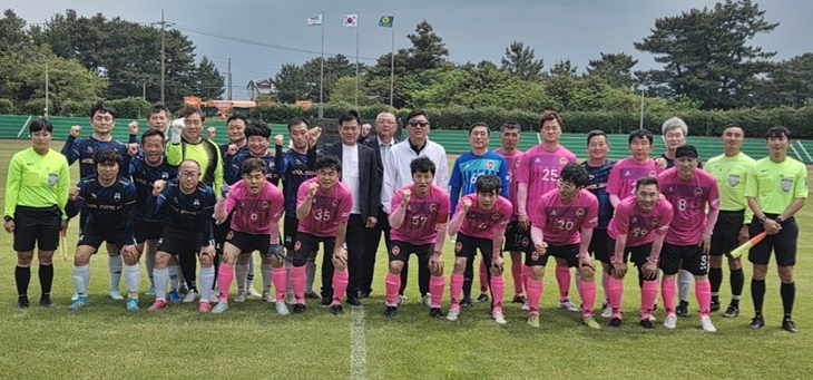 지난 3일 열린 제1회 목인산업배 전도축구대회 개막전에서 기념 촬영하는 참가 선수들. 제주자치도축구협회 제공