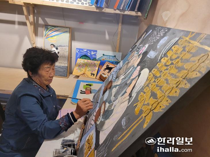 '무지개 할망' 고순자 할머니가 작업공간에서 그림을 그리고 있다.