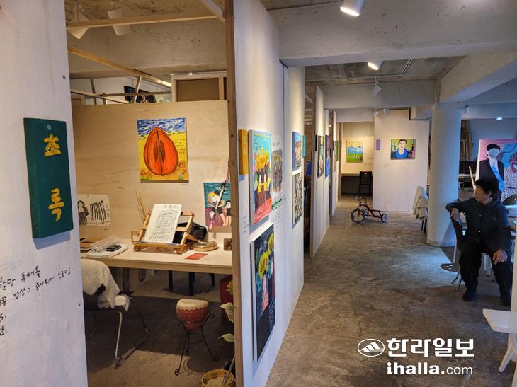 전시공간인 선흘그림작업장은 마을주민들이 옛 농협창고를 개조해 만든 예술공간이자 최근 선흘 그림할망들을 위한 갤러리·레지던시 공간으로 새롭게 꾸며진 곳이다. 선흘마을에는 11명의 그림할망이 있는데, 이 중 9명의 할머니가 이번 첫번째 레지던시 작가로 참여해 이 공간에서 작업을 하고 있다.