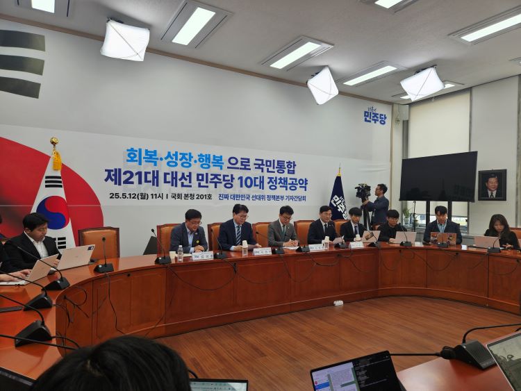 더불어민주당 중앙선대위 정책본부가 12일 국회에서 기자간담회를 갖고 민주당 10대 공약에 대해 설명하고 있다. 부미현 기자.