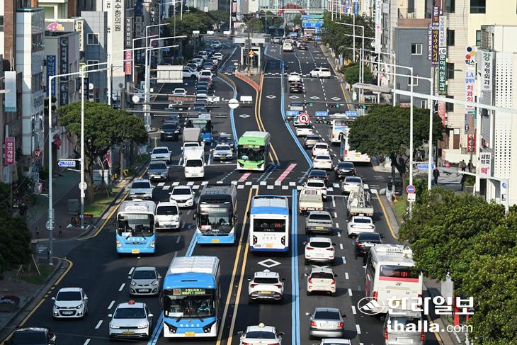 제주형 간설급행버스체계(BRT) 고급화 사업에 따라 지난 9일부터 제주시 서광로를 대상으로 섬식 정류장과 양문형 버스가 운행되면서 출퇴근길 극심한 혼잡이 발생하고 있다. 강희만기자