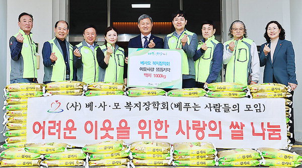 [한라일보] 사단법인 베사모복지장학회(이사장 양창영)는 12일 제주시를 방문해 쌀(10㎏) 100포를 기탁했다.