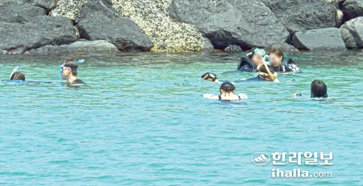 [한라일보] 낮 최고기온이 20℃를 웃돈 13일 제주시 한림읍 판포포구를 찾은 관광객들이 물놀이를 즐기고 있다. 제주지방은 15일 남부지역을 시작으로 16일에는 전역에 많은 비가 내릴 것으로 보인다. 강희만기자