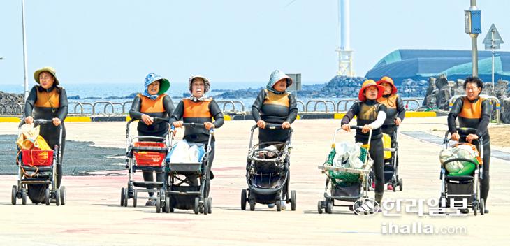 [한라일보] 완연한 봄 날씨를 보인 13일 제주시 한림항에서 해녀어르신들이 담소를 나누며 물질에 나서고 있다. 강희만기자