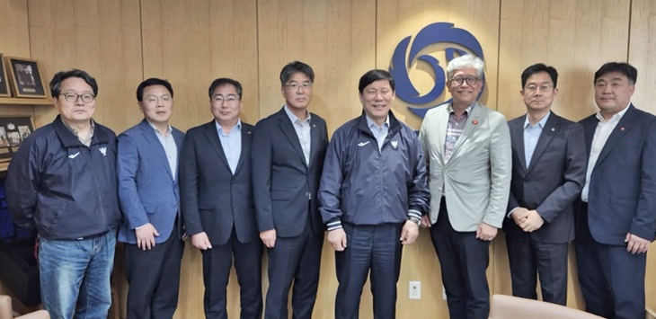 지난 12일 허구연 KBO총재와 면담하는 신진성 도체육회장(왼쪽에서 네번째)과 김양보 제주자치도 문화체육국장(오른쪽에서 세번째).