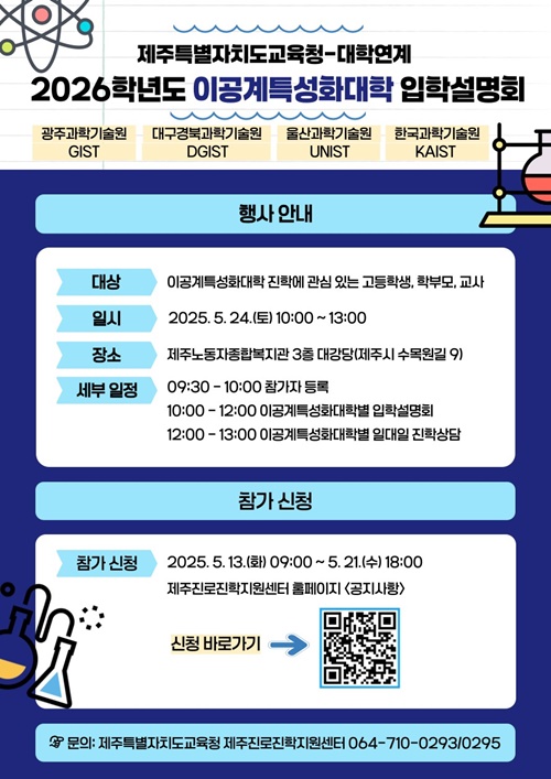 [한라일보] 제주특별자치도교육청은 도내 고등학생과 보호자에게 맞춤형 진학 정보를 제공하기 위해 오는 24일 제주노동자종합복지관 3층 대강당에서 '이공계특성화대학 연계 입학설명회'를 연다고 14일 밝혔다.
