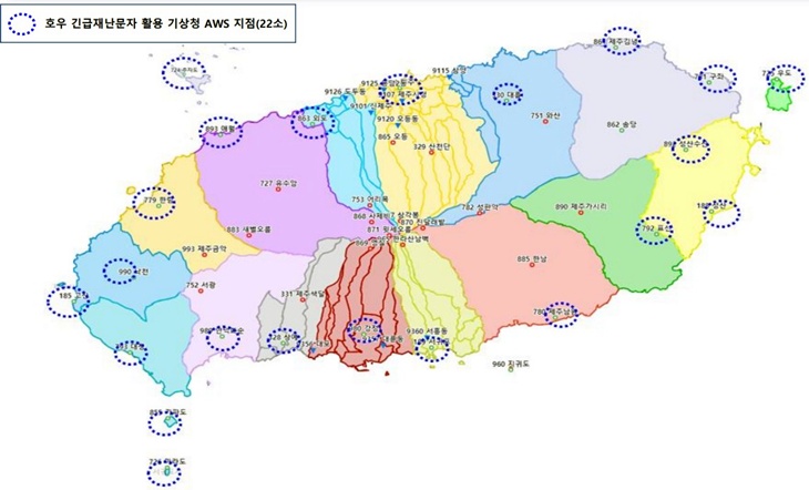 도내 AWS(자동기상관측장비) 22개 지점. 기상청 제공