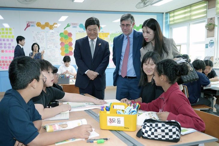 15일 제주형 자율학교 중 IB(국제바칼로레아)학교인 제주북초등학교에서 APEC 교육장관회의 대표단이 김광수 교육감과 함께 수업 모습을 참관하고 있다. 제주도교육청 제공