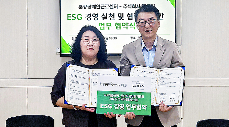 사회복지법인 춘강 산하 춘강장애인근로센터와 주식회사 제클린은 15일 ESG 경영 실천과 기후위기 대응을 위한 친환경 리사이클·업사이클 제품 공동 개발을 목적으로 전략적 업무협약을 체결했다.