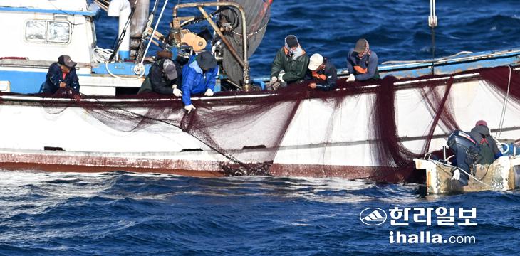 국토 최남단 마라도 인근 해상에서는 봄철 제주인들의 입맛을 돋우는 자리돔을 잡는 어부들이 그물을 끌어 올리고 있다. 한라일보DB