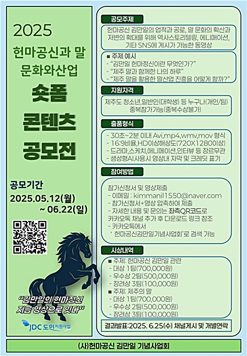 [한라일보] 사단법인 헌마공신김만일 기념사업회는 오는 6월 22일까지 '2025 헌마공신과 말 문화와 산업' 숏폼 콘텐츠 공모전을 진행한다고 18일 밝혔다.