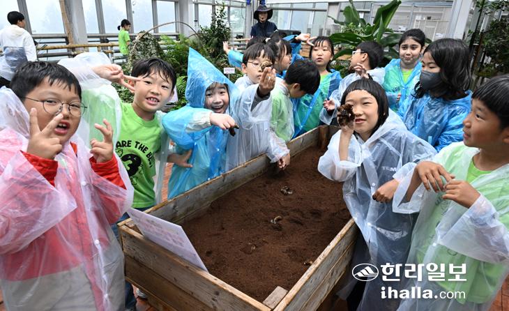 [한라일보] 지난 16일 서귀포시 성산읍 제주자연생태공원 체험활동에 나선 제주북초등학교 어린이들이 자연체험활동을 하고 있다. 강희만기자