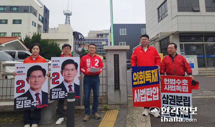 국민의힘 서귀포시당협 고기철 위원장 등이 20일 오전 제주지방법원 서귀포시법원 앞에서 '사법 독립 수호, 독재 저지' 긴급 호소문을 발표하고 있다. 국민의힘 서귀포시 당협 제공