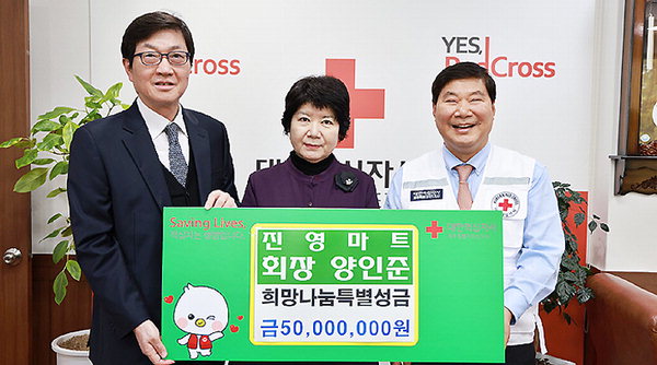 [한라일보] 진영마트 양인준 회장(왼쪽)은 지난 20일 대한적십자사제주도지사(회장 정태근)를 방문해 희망나눔 성금 5000만원을 기탁했다.