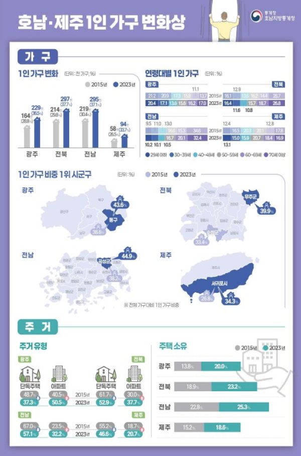 호남지방통계청이 22일 발표한 '호남·제주지역 1인 가구 변화상' 자료에 따르면 2023년 기준 제주지역 1인 가구는 9만3739가구로 전체 가구의 33.7%를 차지했다. 이는 전국 평균(35.5%)에는 미치지 못한 수치로, 전국 17개 시·도 가운데 13번째로 많았다. 2015년(5만8446가구)과 비교하면 3만5000여 가구(약 60%) 증가했다.
