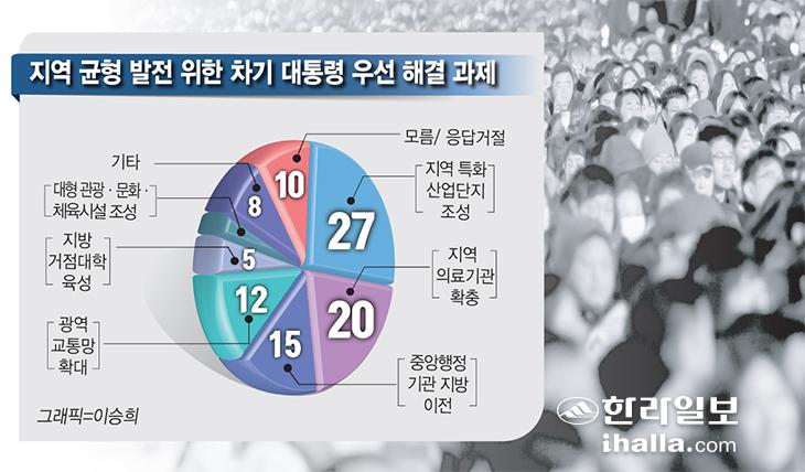 지역균형발전을 위한 차기 대통령의 우선 해결 과제는 '지역특화산업단지 조성'(27%)이 1위였다. 이어 '지역의료기관 확충'(20%), '중앙행정기관 지방 이전'(15%), '광역교통망 확대'(12%), '지방거점대학 육성'(5%), '대형 관광·문화·체육 시설 조성'(3%) 순이었다.