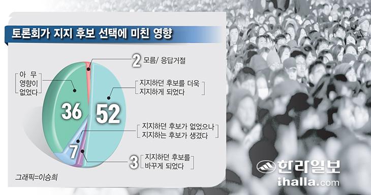 TV 토론회가 지지 후보 선택에 미친 영향에 대해 묻는 질문에는 '지지하던 후보를 더욱 지지하게 됐다'는 응답이 52%로 나타났다. '아무 영향이 없었다'는 응답은 36%, '지지하던 후보가 없었으나 지지하는 후보가 생겼다' 7%, '지지하던 후보를 바꾸게 됐다' 3%다.