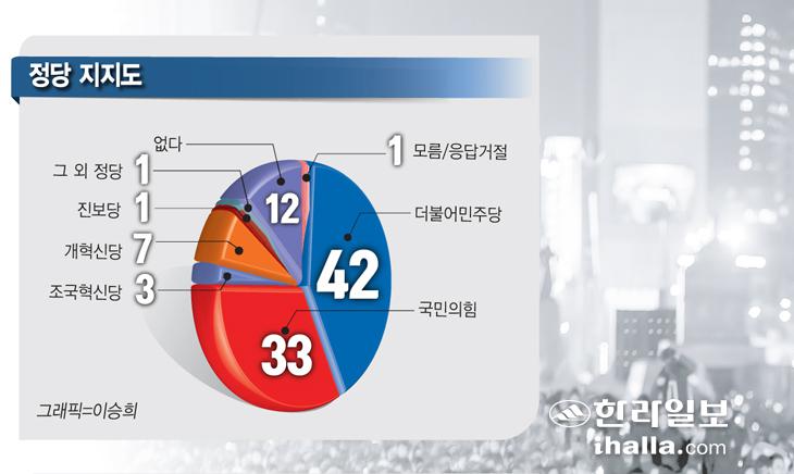 [한라일보] 정당지지도는 더불어민주당 42%, 국민의힘 33%로 집계됐다. 격차는 9%p였다. 이어 개혁신당 7%, 조국혁신당 3%, 진보당 1% 순이었다. 또, '지지정당 없음' 12%. '그 외 정당' 1%, '모름·응답거절' 1%였다.