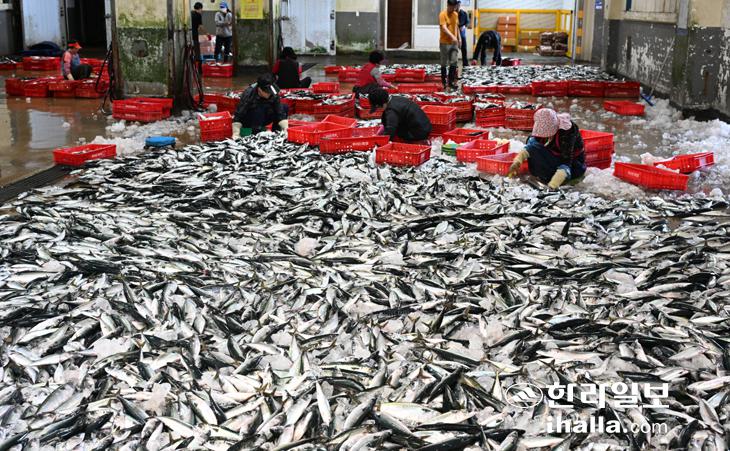 [한라일보] 22일 제주시수협 위판장에서 어민들이 밤사이 제주 근해에서 잡힌 싱싱한 고등어를 크기에 맞게 분류하는 작업을 하고 있다. 강희만기자