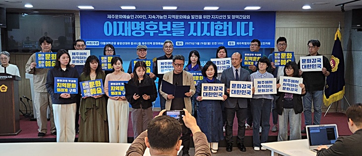 이들은 이날 제주도의회 도민카페에서 기자회견을 열어 "'문화강국' 공약을 내건 이재명 후보가 문화는 산업이고 국가의 힘이고 국민행복의 선한 수단으로 인식하고 있음을 우리는 확신한다"며 이같이 밝혔다.