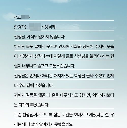 "선생님은 항상 학생들을 생각하고 우선시하는 선생님이었습니다. 더 이상 이런 비극이 반복되지 않게 교사와 학생에게 모두 안전한 환경이 마련되기를 간곡히 바랍니다.(강모 군)"
