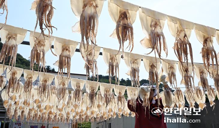 [한라일보] 26일 제주시 한경면 고산리에서 어민들이 따스한 봄햇살 아래 오징어 말리기 작업을 하고 있다. 강희만기자