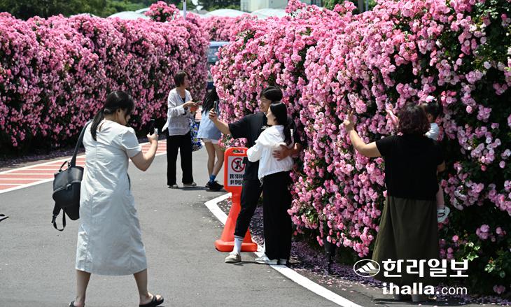 [한라일보] 26일 서귀포시 예래동의 한 음식점 진입로에 장미가 활짝 펴 이곳을 찾은 도민·관광객들의 시선을 사로잡고 있다. 이곳을 찾은 도민·관광객들이 장미꽃을 배경으로 사진을 촬영하느라 분주한 모습이다. 강희만기자