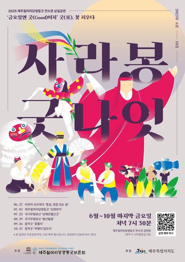 [한라일보] 다시 '굿'의 향연이 펼쳐진다. 내달부터 10월까지 매월 마지막 주 금요일 제주시 사라봉에 위치한 제주칠머리당영등굿전수관 공연장에서 만나는 상설공연 '금요일엔 굿(Good)이지_굿(巫), 꽃 피우다'다. 제주굿공연부터 국가무형유산공연, 창작공연 등 신바람 나는 다양한 무대를 즐길 수 있는 시간이다.