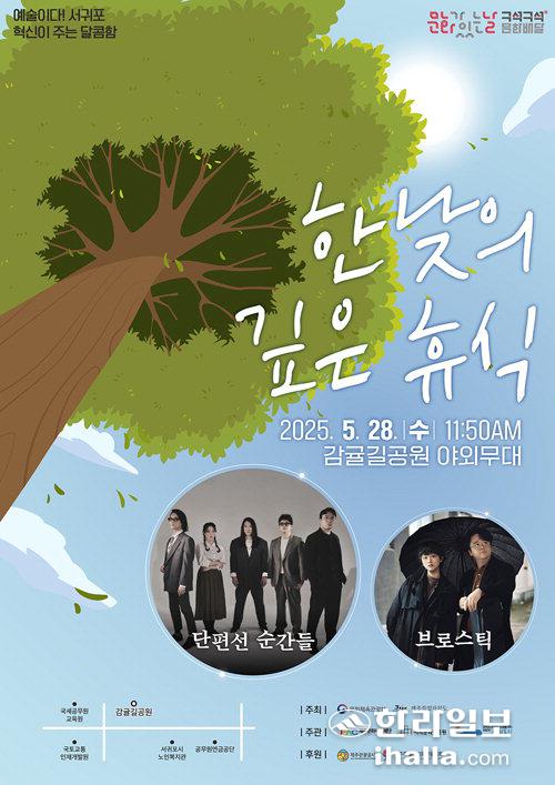 이달 28일 오전 11시 50분부터 감귤길 공원에서 열리는 '한낮의 깊은휴식-런치콘서트'에는 22회 한국대중음악상 올해의 음반과 최우수 모던록 음악을 수상한 인디밴드 '단편선 순간들'과 제주를 중심으로 활동하는 어쿠스틱 듀오 '브로스틱'이 출연한다.
